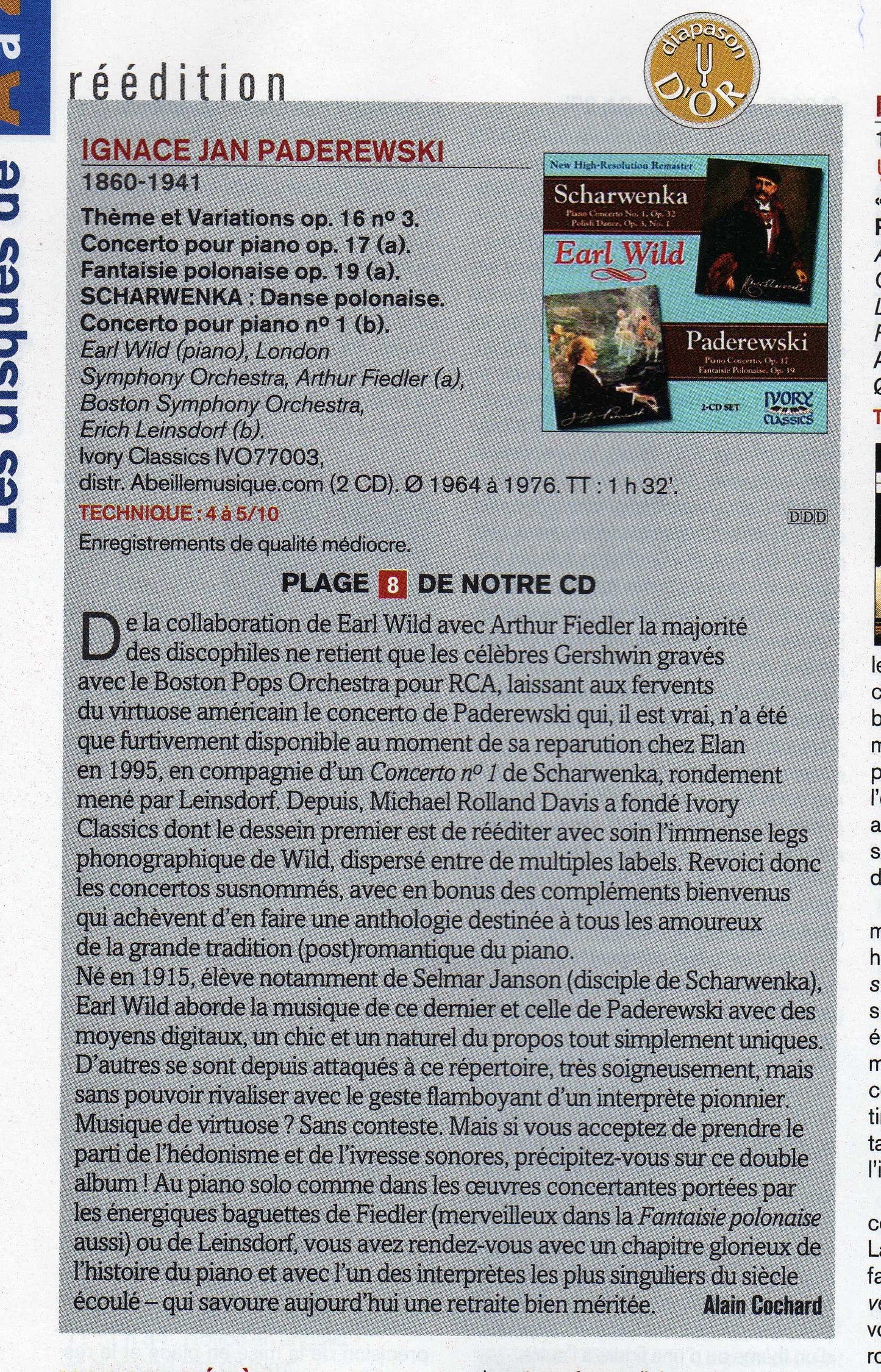 Paderewski's solo Theme and Variations, Op. 16, No. 3 and his Fantaisie Polonaise in G Minor, Op. 19 in which Wild is again joined by Fiedler and the LSO (the last-named conspicuous for the sheer velocity of the soloist part) fill out Disc 1 very nicely.